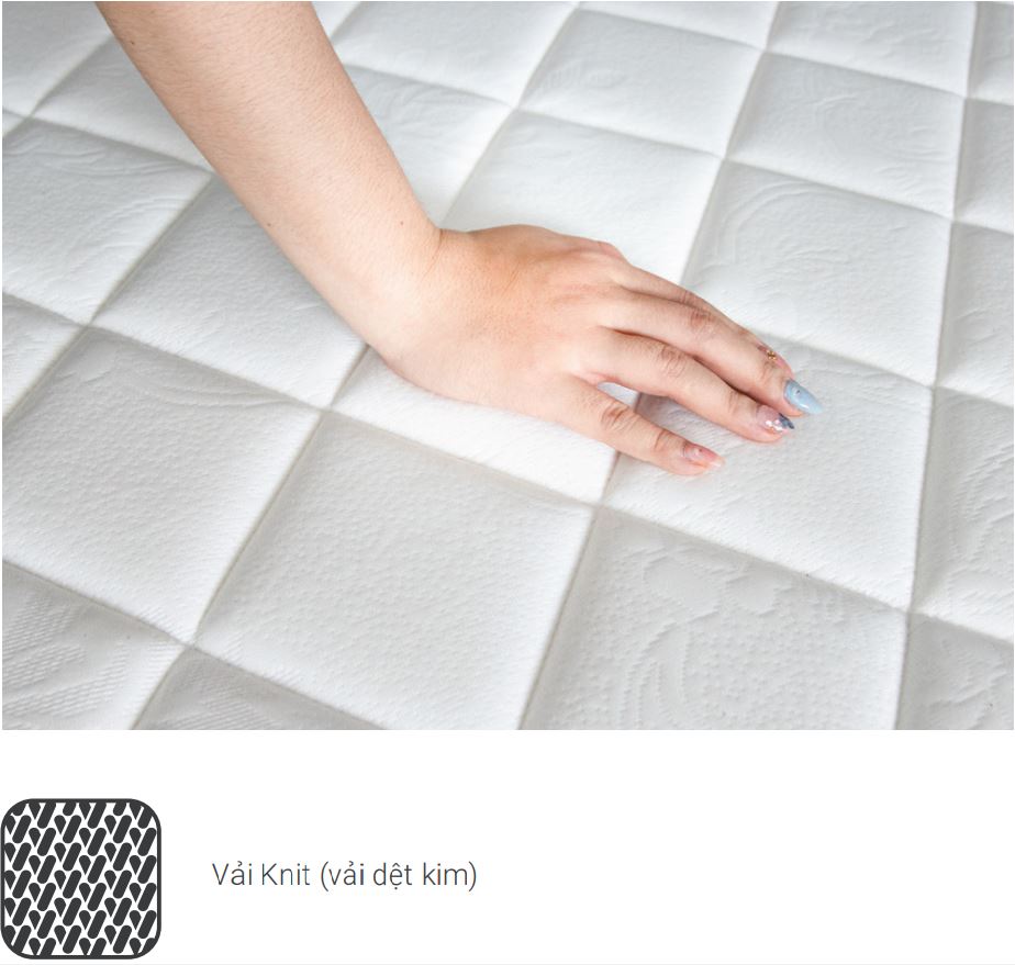 Vải dệt kim (hay vải Knit) mềm mại, có tính năng co giãn tốt, không bị nhăn trong suốt quá trình sử dụng nệm.