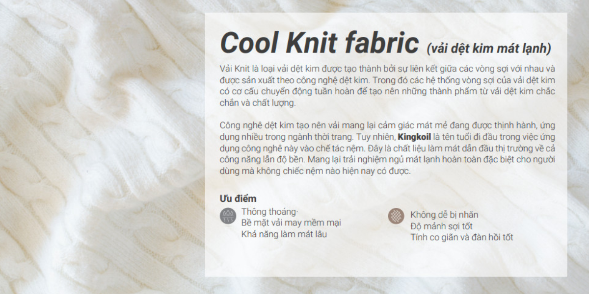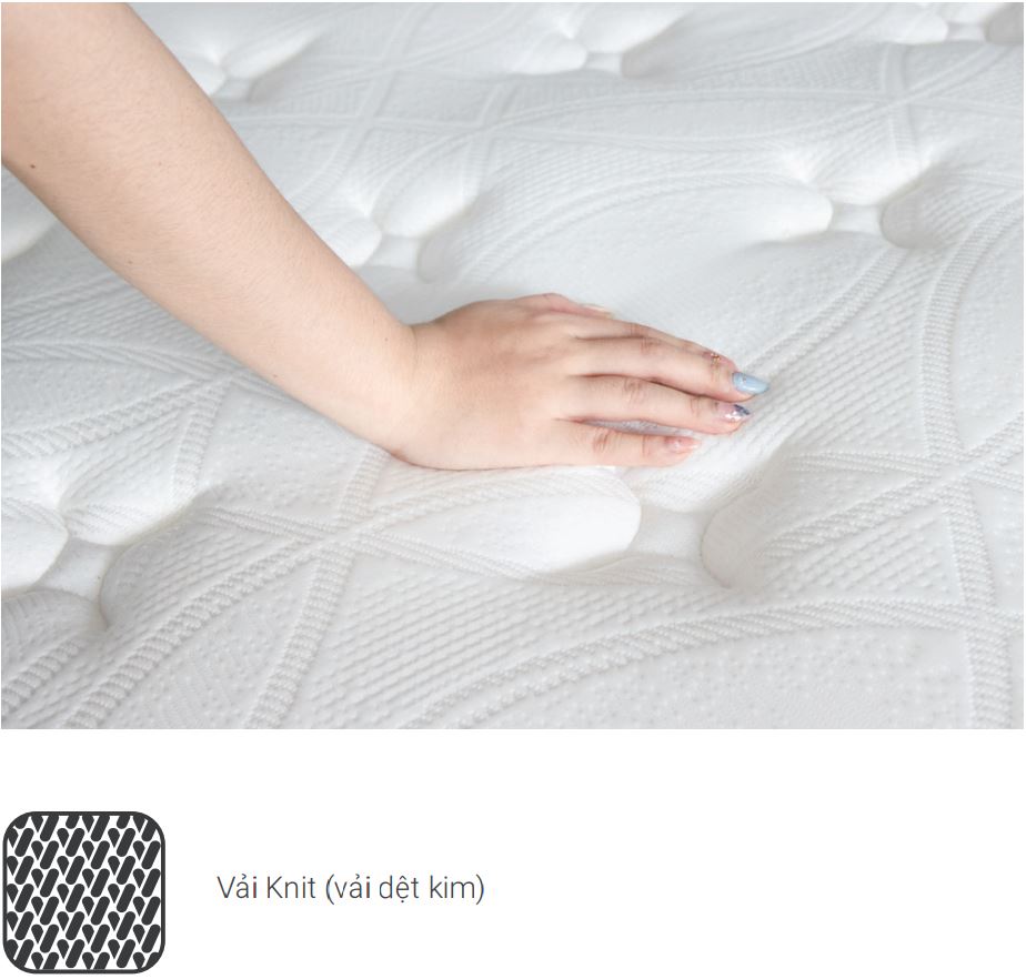 Vải bọc cao cấp: lớp vải bọc chần dày tạo sự êm ái và thoải mái vượt trội. Sự kết hợp hoàn hảo giữa các lớp mút cao cấp có độ đàn hồi tốt đem lại cho người nằm cảm giác mềm mại, được nâng niu trong từng giấc ngủ